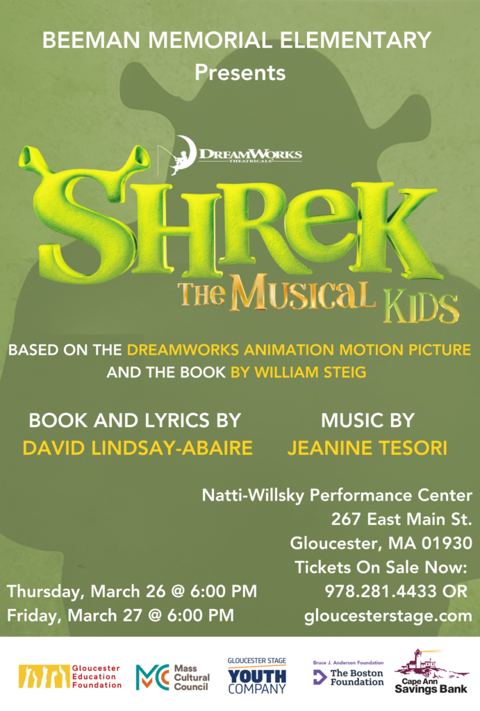 Shrek KIDS plays Thursday, March 26 and Friday, March 27 at 7:00pm. Runtime 30 minutes, no intermission. All performances at the Natti-Willsky Performance Center: Home of Gloucester Stage Company at 267 E Main Street, Gloucester, MA 01930. Perfect for families with children ages 6+.